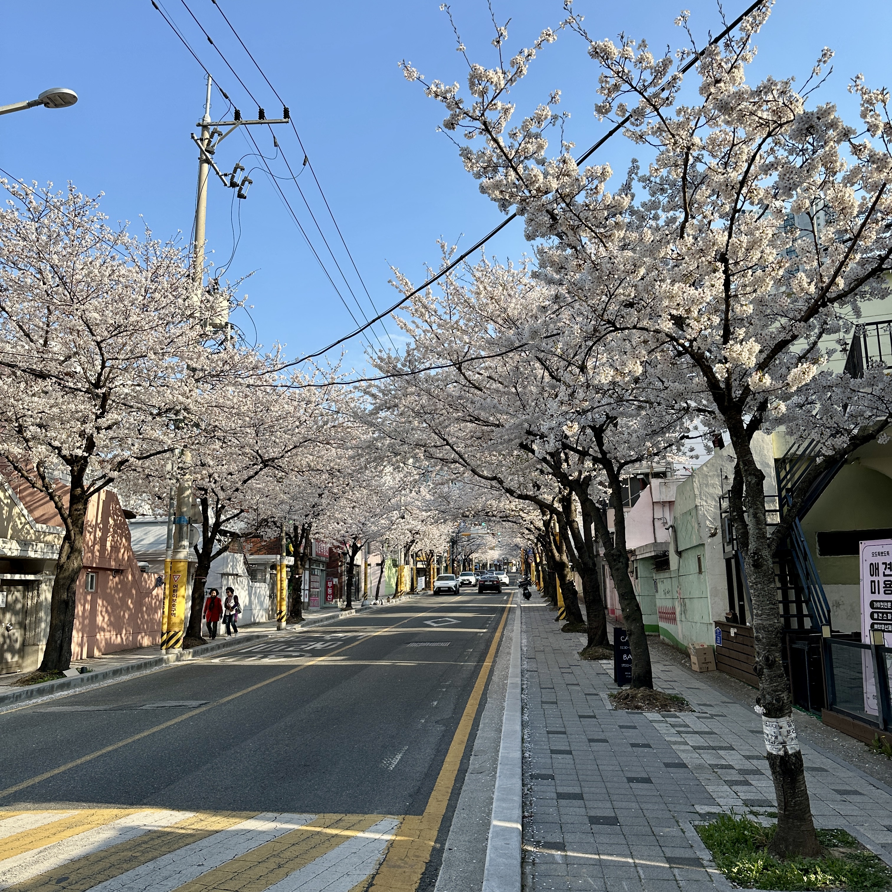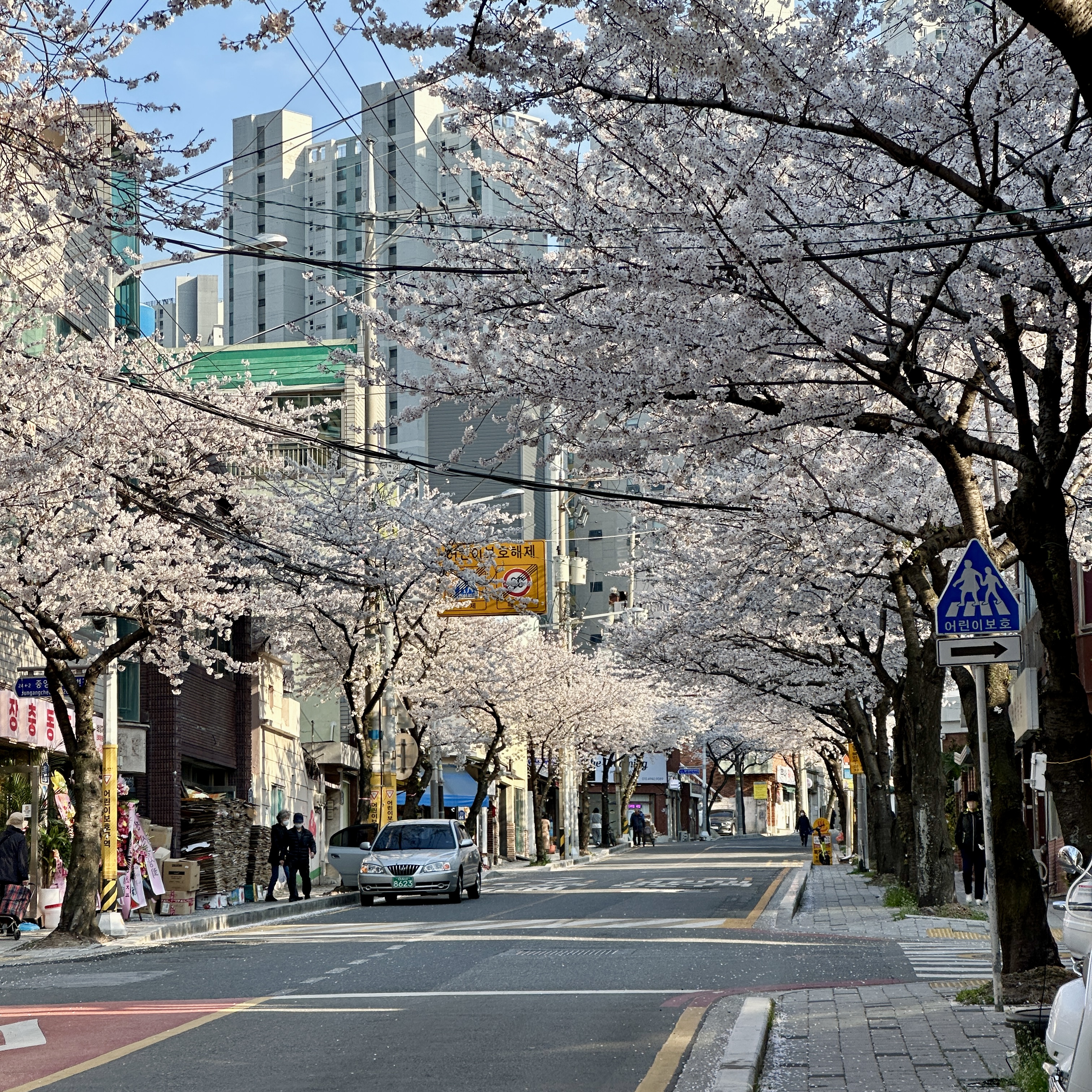 개인적으로 연산동 중앙천로 벚꽃길처럼 양쪽에서 자란 벚꽃으로 인해 가운데에 터널처럼 만들어지는 형태를 가장 좋아합니다. 온천천 시민공원의 벚꽃은 하천을 중심으로 벚꽃이 양쪽으로 꽤 떨어져 있기 때문에 이런 풍경을 보기가 어렵습니다. 그래서인지 중앙천로의 벚꽃길이 저는 꽤 마음에 들었습니다.