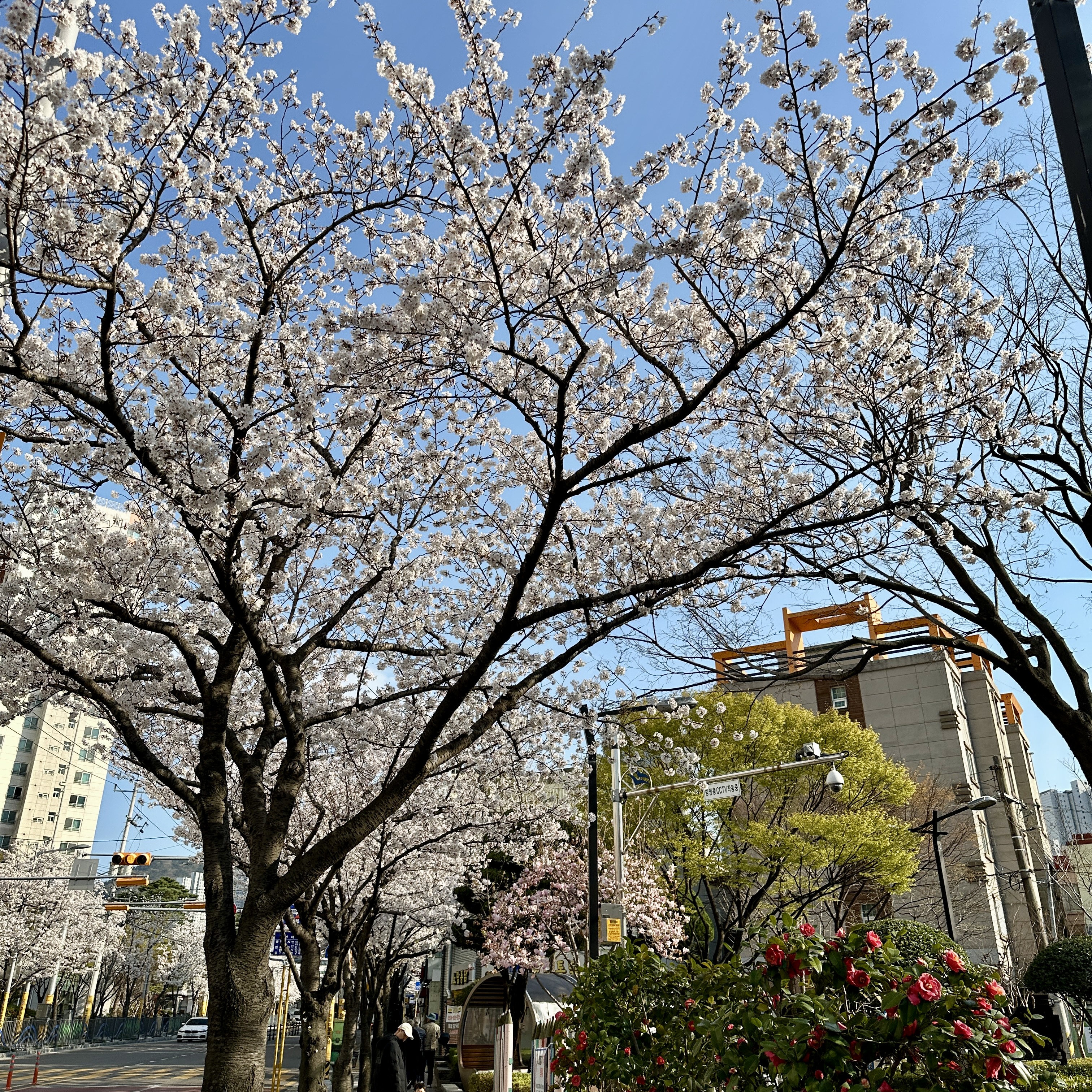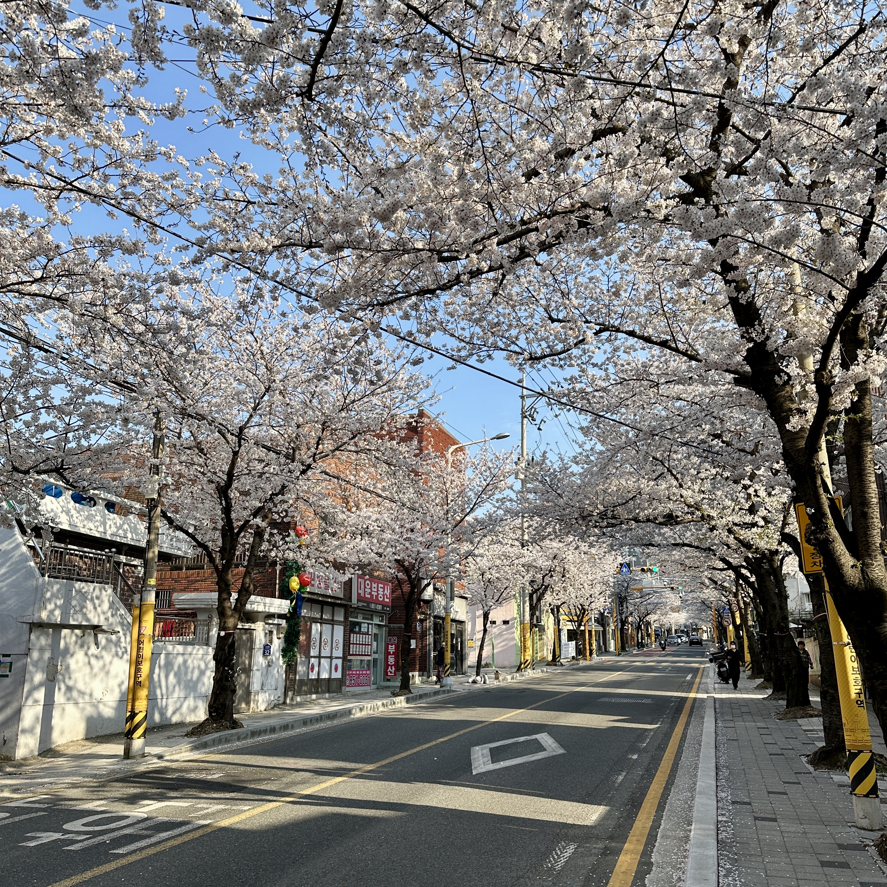 개인적으로 연산동 중앙천로 벚꽃길처럼 양쪽에서 자란 벚꽃으로 인해 가운데에 터널처럼 만들어지는 형태를 가장 좋아합니다. 온천천 시민공원의 벚꽃은 하천을 중심으로 벚꽃이 양쪽으로 꽤 떨어져 있기 때문에 이런 풍경을 보기가 어렵습니다. 그래서인지 중앙천로의 벚꽃길이 저는 꽤 마음에 들었습니다.