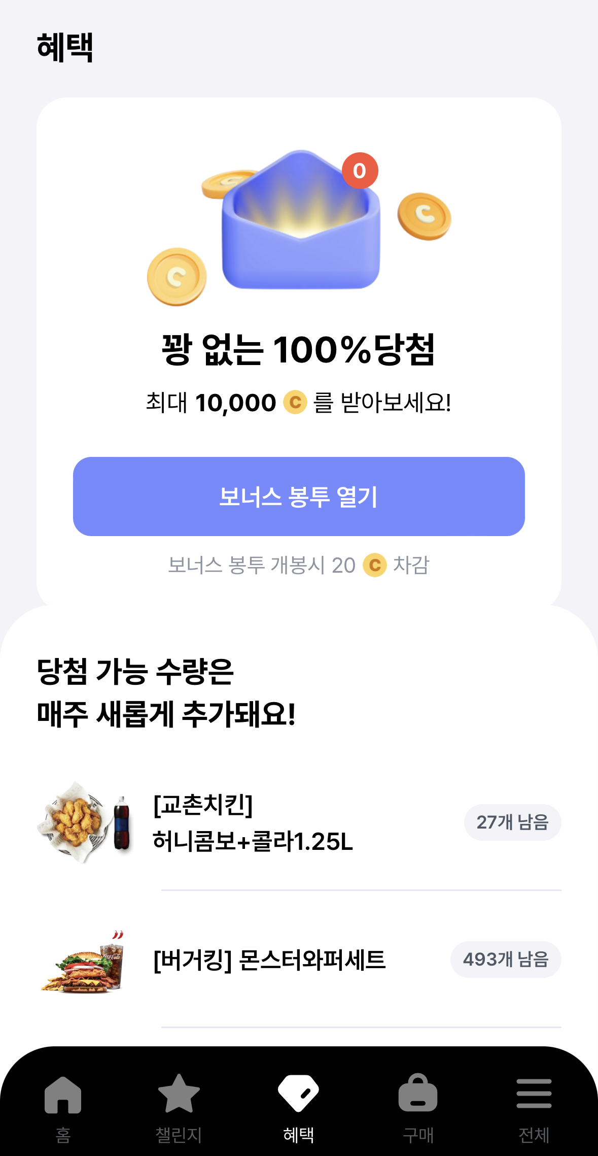 포인트 20 코인을 사용해 보너스 봉투 열기에 참여할 수 있습니다. 꽝 없는 100% 당첨 이벤트입니다. 최대 10,000 코인의 포인트를 받을 수도 있습니다. 교촌치킨, 버거킹, 던킨도너츠, 파리바게뜨 경품도 받을 수 있습니다.