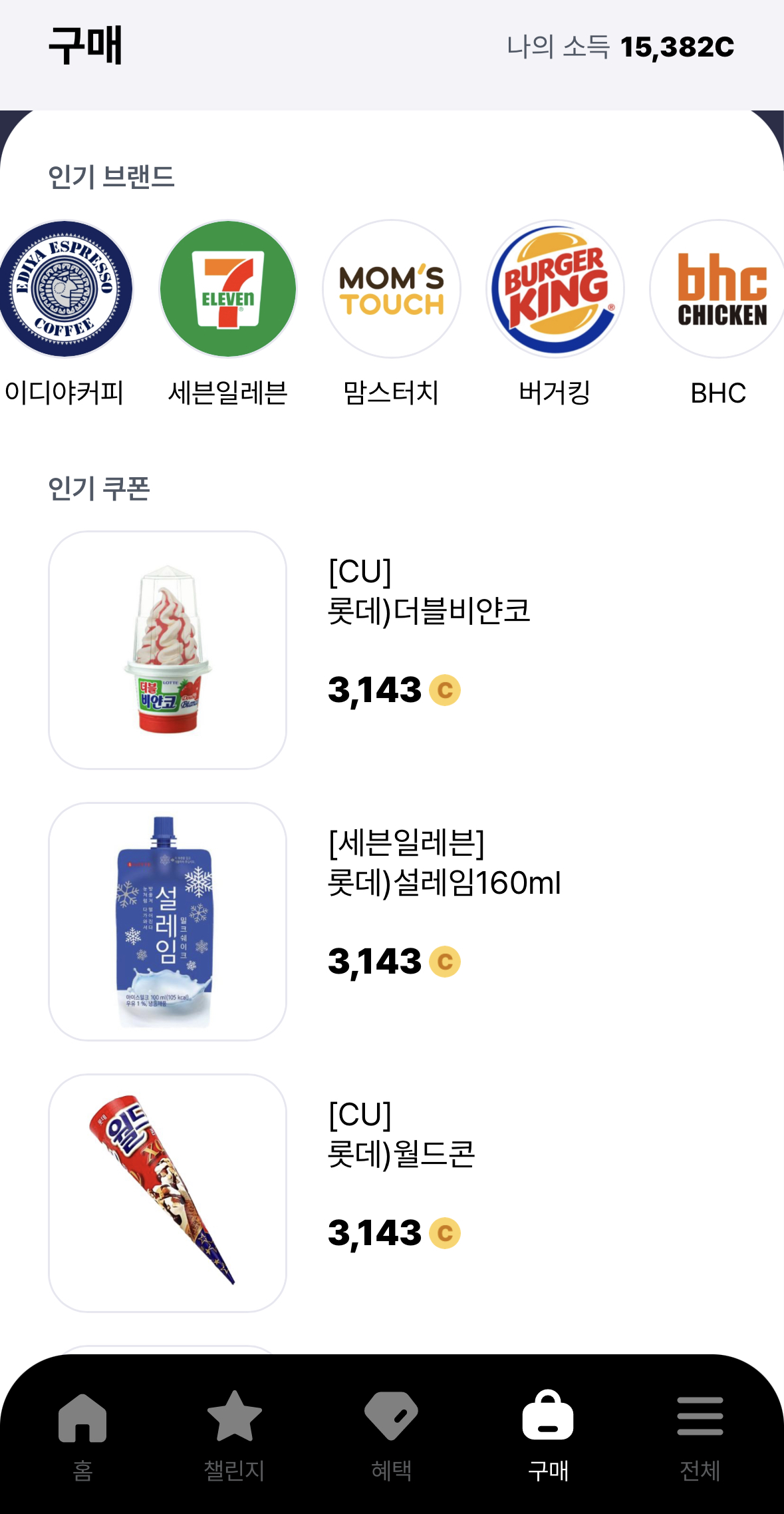 보유한 포인트 코인을 사용해서 상품권이나 쿠폰, 실제 물건으로 교환할 수 있습니다. 구매가능한 브랜드는 스타벅스, 파리바게뜨, 빽다방, 배스킨라빈스, 이디야커피, 투썸플레이스, 뚜레쥬르, 던킨도너츠, 할리스, 크리스피도넛, 신세계 상품권, 문화상품권, 이마트, 롯데시네마, 메가박스, CU, 세븐일레븐, GS25, 맘스터치, 버거킹, BHC, 롯데리아, 도미노피자, 교촌치킨, 미스터피자, 피자헛 등이 있습니다.