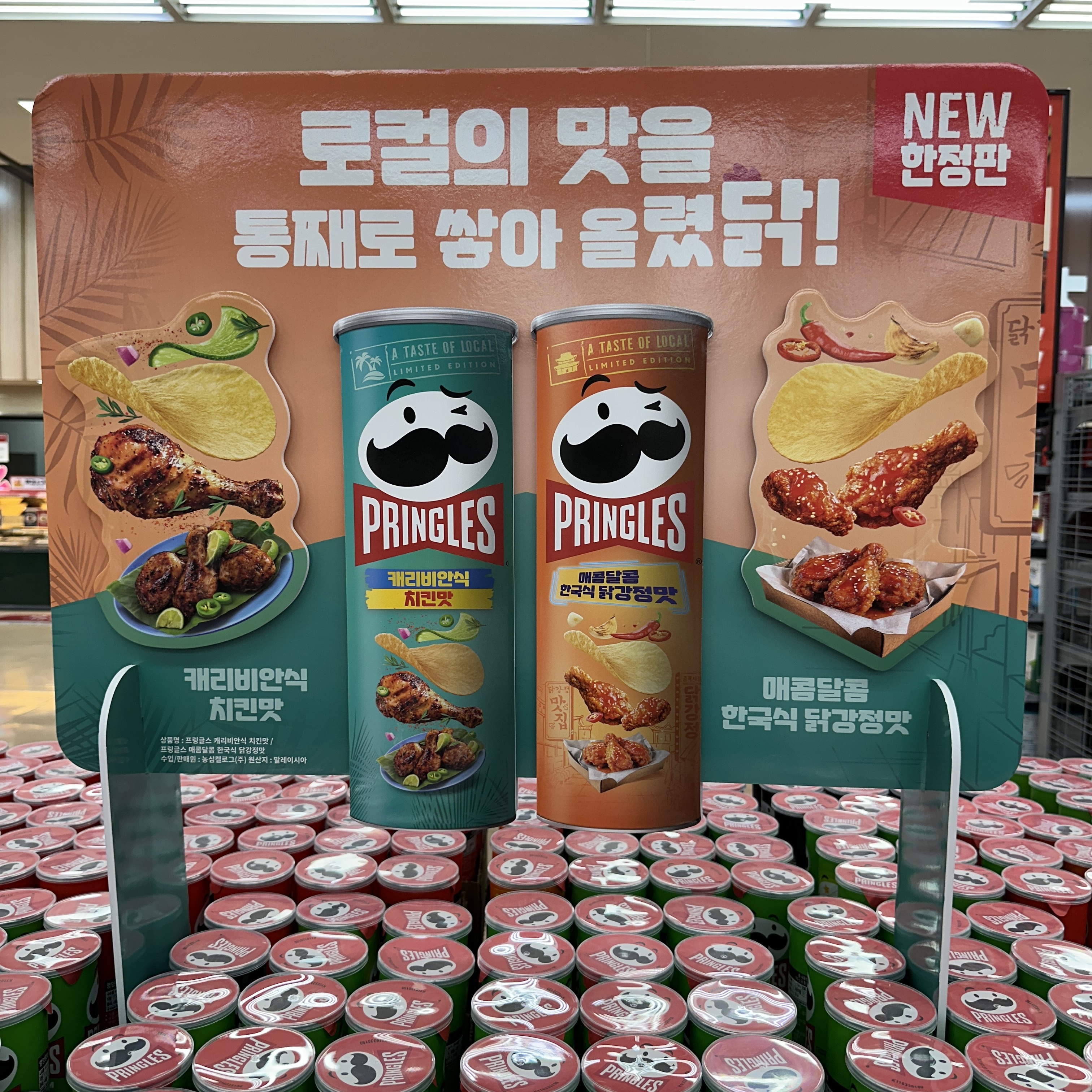 프링글스는 다양한 맛을 가지고 있습니다. 개인적으로는 오리지널 맛을 가장 좋아하지만 맛이 추가될 때마다 궁금해서 먹어보는 편입니다. 이번에 출시된 매콤달콤 한국식 닭강정맛과 캐리비안식 치킨맛은 우연히 발견하게 되었지만 호기심을 충족시키기 위해서 바로 구매해서 먹어봤습니다. '로컬의 맛'이라는 테마를 바탕으로 한국의 맛과 이국적인 맛이 돋보이는 두 가지 과자가 출시되었습니다.